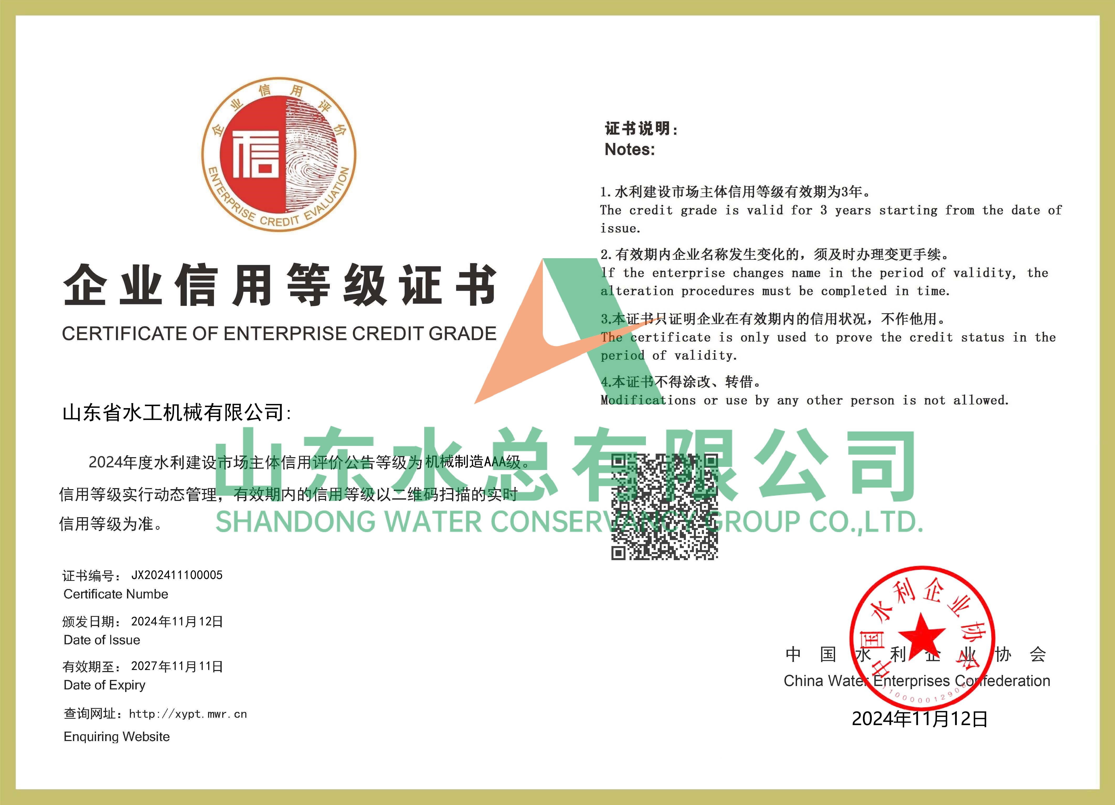 水工机械公司获全国水利建设市场AAA主体信用评价