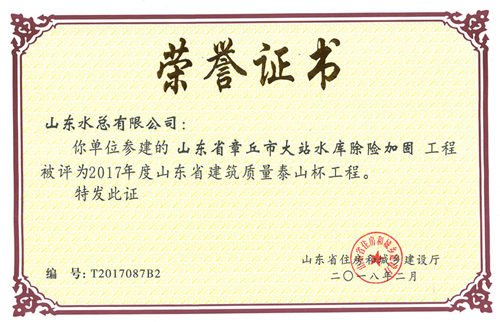 公司“山东省章丘市大站水库除险加固工程”荣获2017年度山东省建筑质量泰山杯