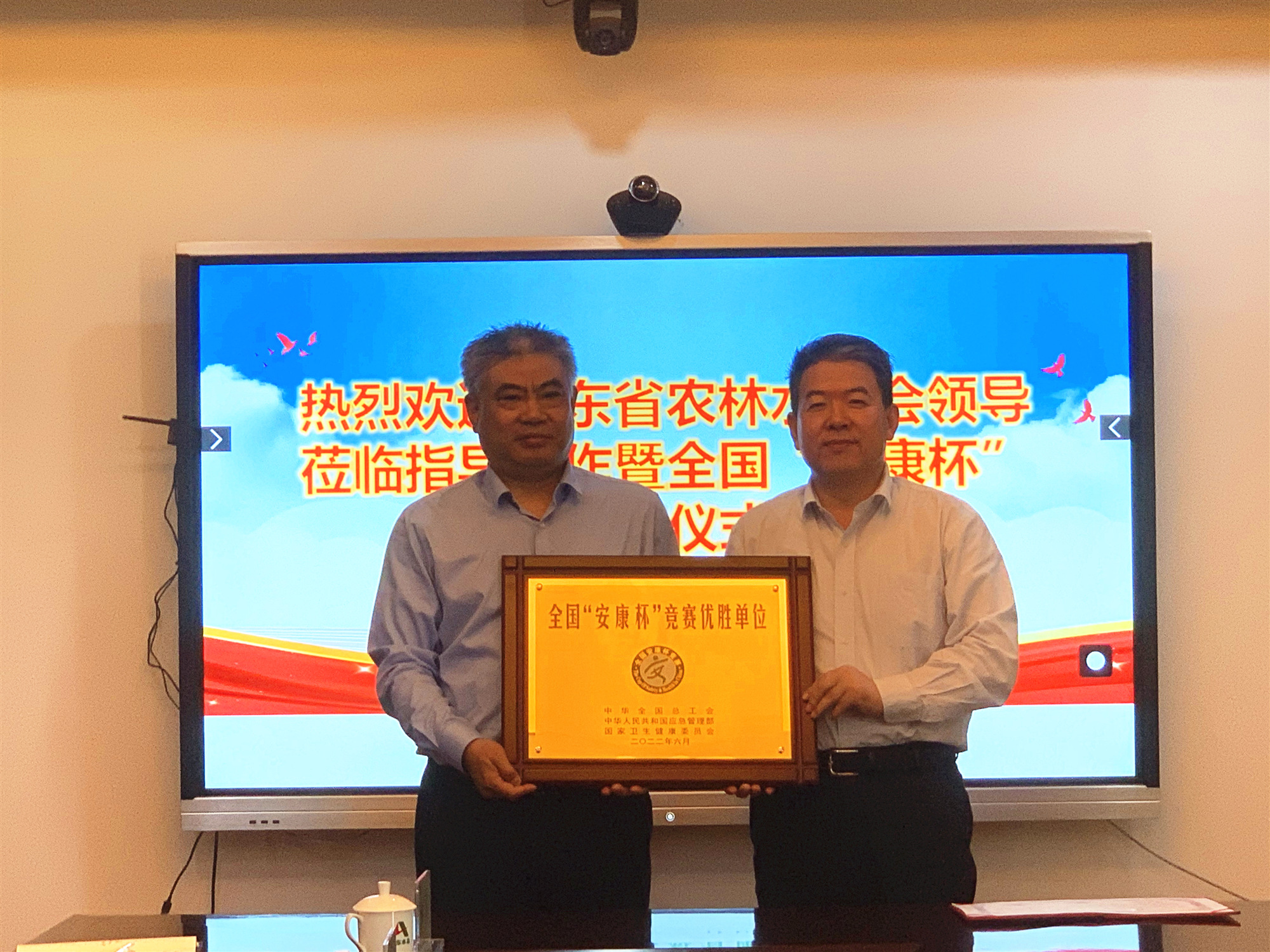 5月12日,公司举行了全国、山东省“安康杯”竞赛优胜单位授牌仪式。省农林水工会主席张志刚、主任科员吴开明,公司党委书记、董事长刘深远,党委副书记、董事、总经理靳文硕,党委委员、副总经理付海华,党委组织部、安全管理部相关人员参加仪式活动。